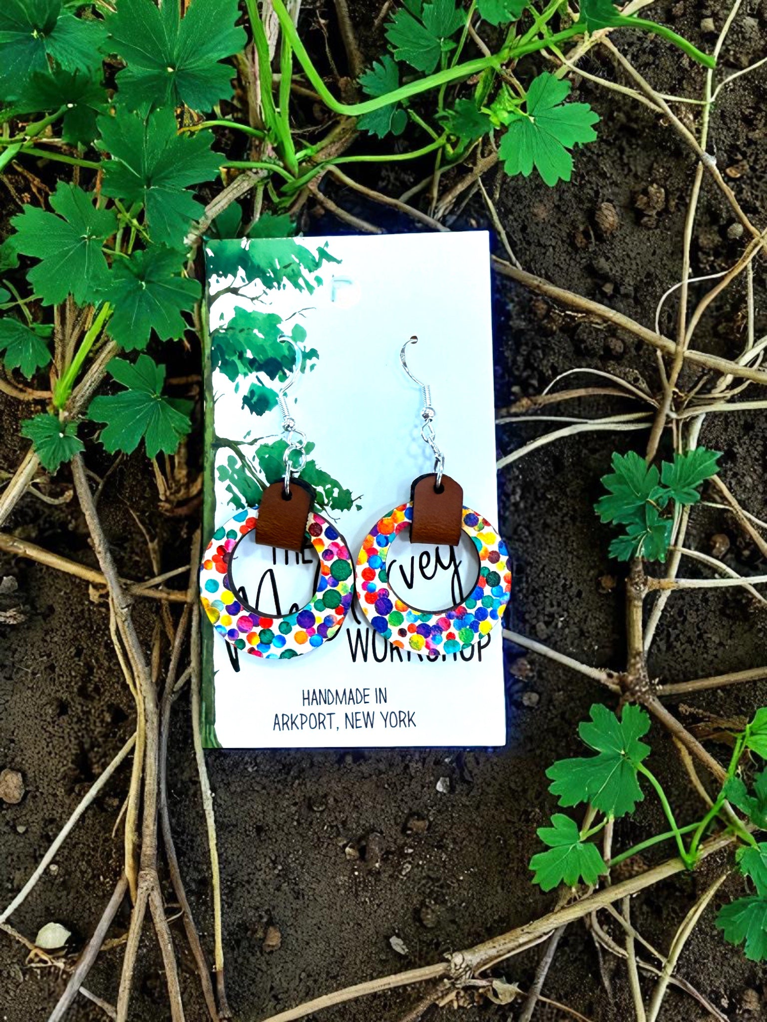 Wood and Leather Hoop Dangle Earrings, Colorful Wood Earrings, Hypoallergenic
